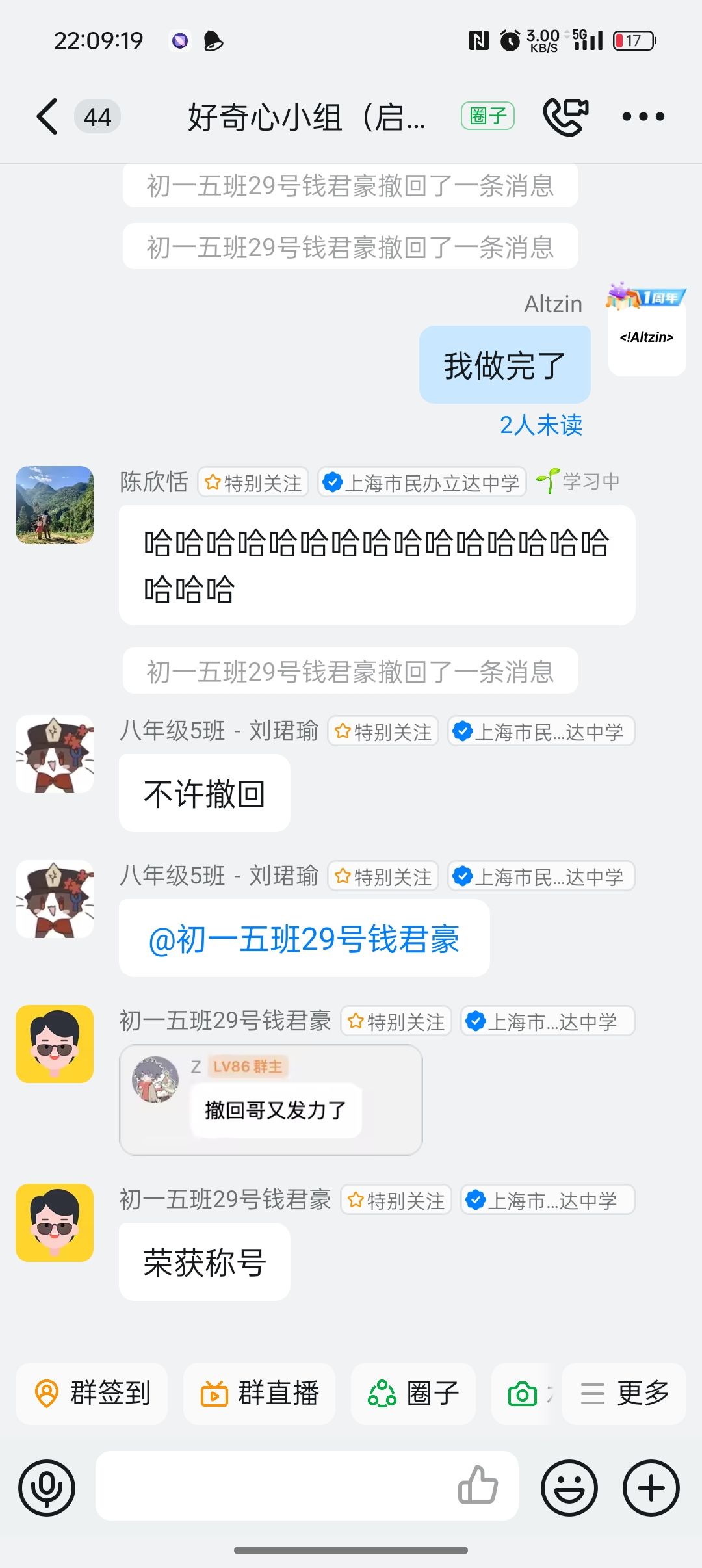 0529钱君豪撤回了一条消息,没有人留下了补档,刘珺瑜说"不许撤回",钱君豪首次给我们展示他的宗主给他的称号撤回哥。