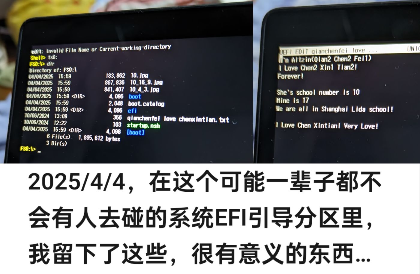 那天,我(0517)突然感觉很爱陈欣恬,而且我正在研究uefi shell,然后我便用uefi的edit在一台电脑的引导分区内留下了一些关于我爱陈欣恬的话。